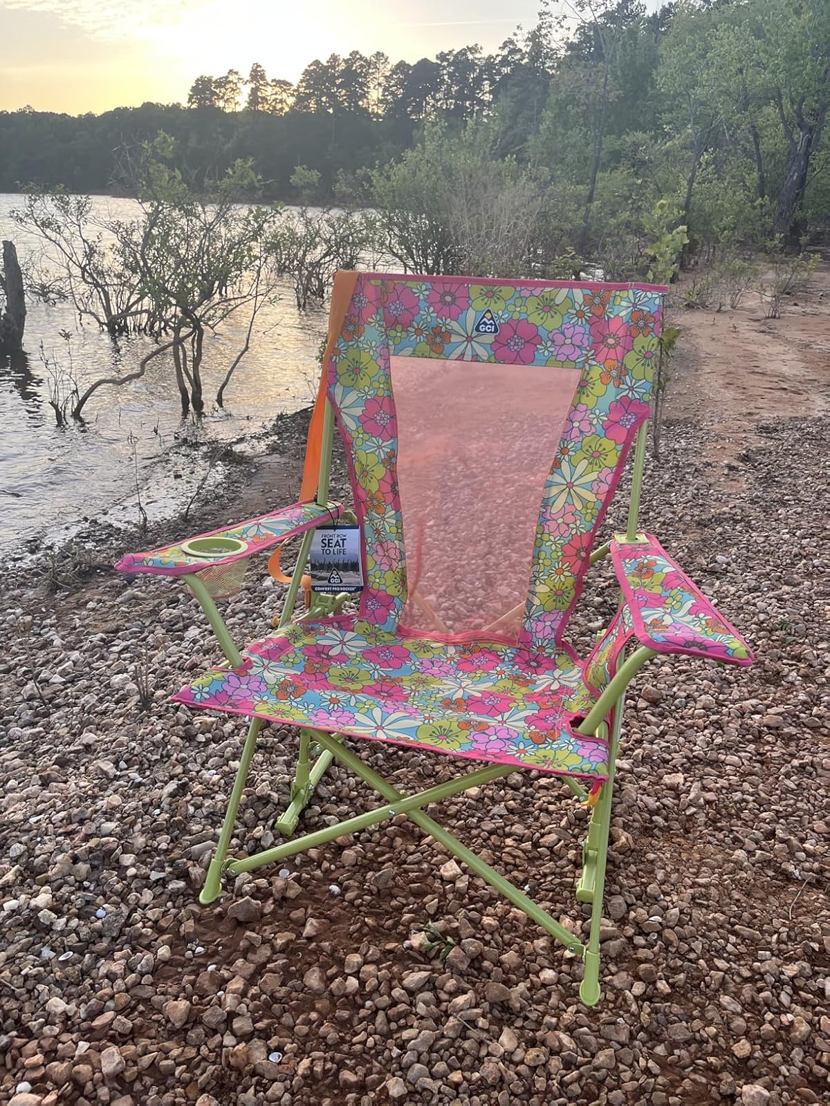 First off, it’s so cute! But it’s is also functional. It’s pretty lightweight. It has a strap right on it for carrying so that works great. Also when you fold it up there’s a small strap closure to keep it from unfolding. It has a drink spot which can also fit my phone. There is a phone holder but your phone will stick up above the armrest. The rocking feature is really nice as well. No complaints with this chair honestly!
