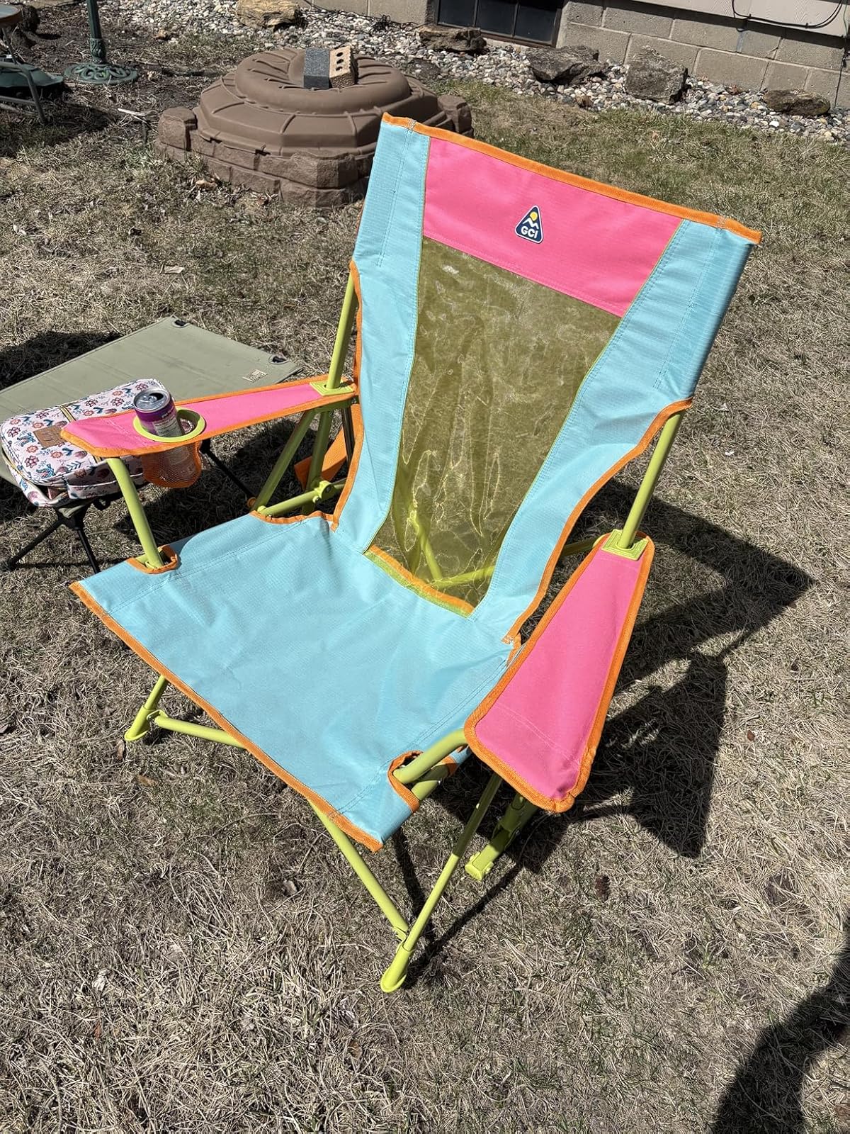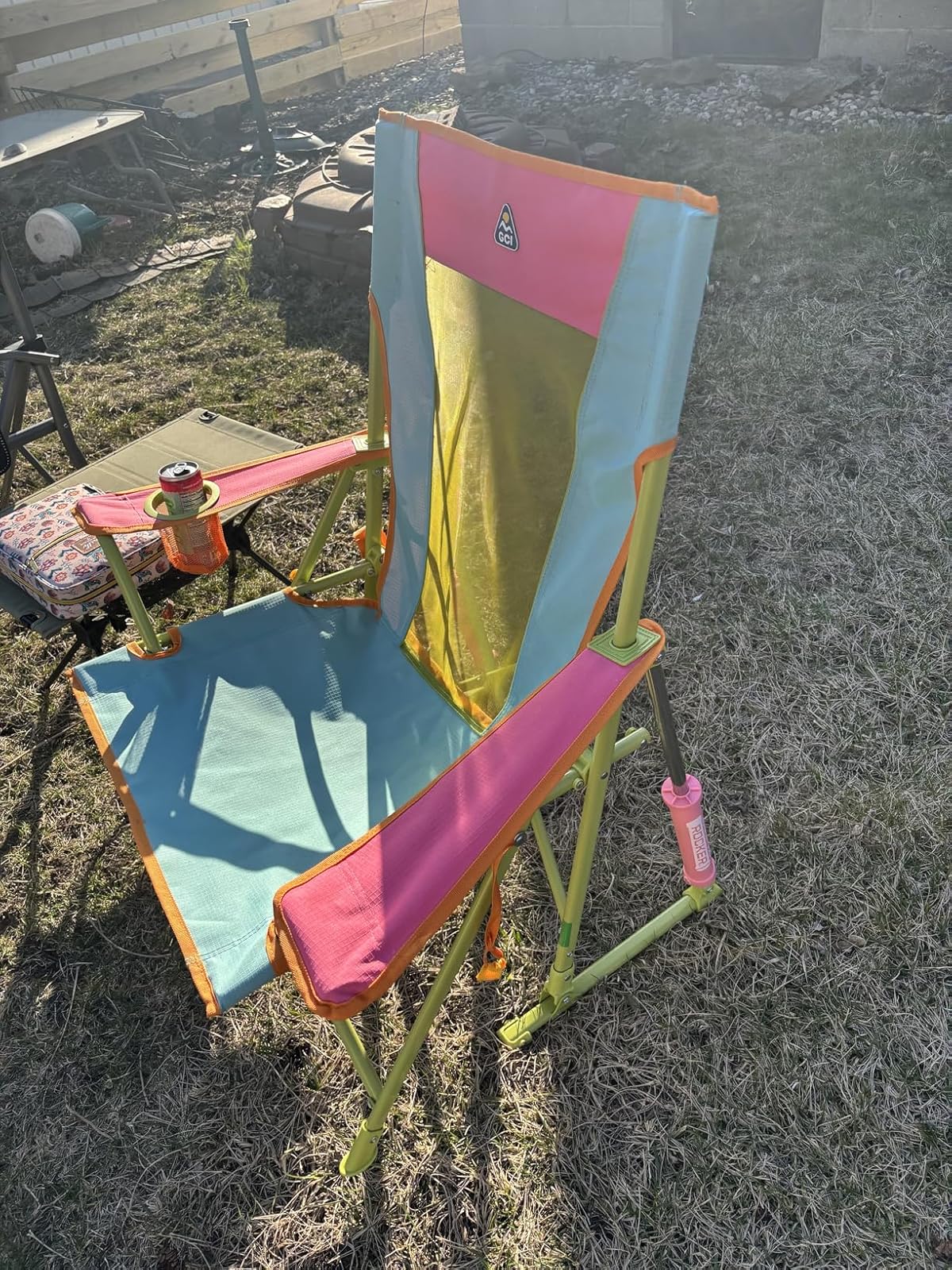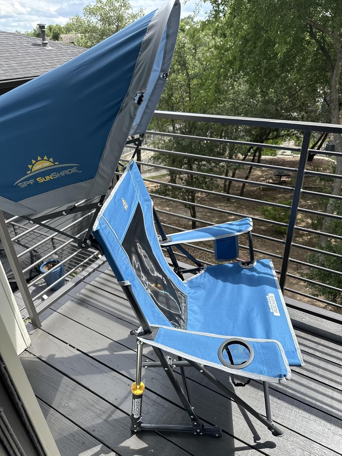 Looks better in person. Nice build quality overall. Comfortable, and the rocking mechanism works great. If you’ve wanted to experience the feeling of leaning back in a folding camp chair, this is your pick. Also the shade is awesome.