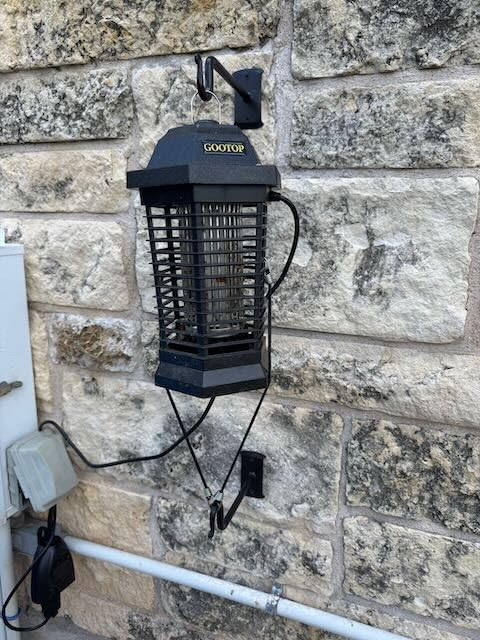 This product works very well in our backyard. As you can see from the photo, I hung it on an outside wall using another product from Amazon, RTZEN Plant Hangers. I used one of the hanging loops to attach the Gootop Bug Zapper and inverted and mounted the other RTZEN hanger to accommodate two bungee cords (Horusdy 31 Piece) attached underneath the Bug Zapper to keep it from slamming into the wall from the high winds we sometimes have. Also, I purchased the Amazon Basics Outdoor Smart Plug and programmed a routine that turns on the plug with the zapper 1 hour before sunset and turns it off at 1:00 am. The zapper works great and we have not had the bugs and mosquitoes we typically have from living adjacent to a greenbelt. I recommend all three of these Amazon products!