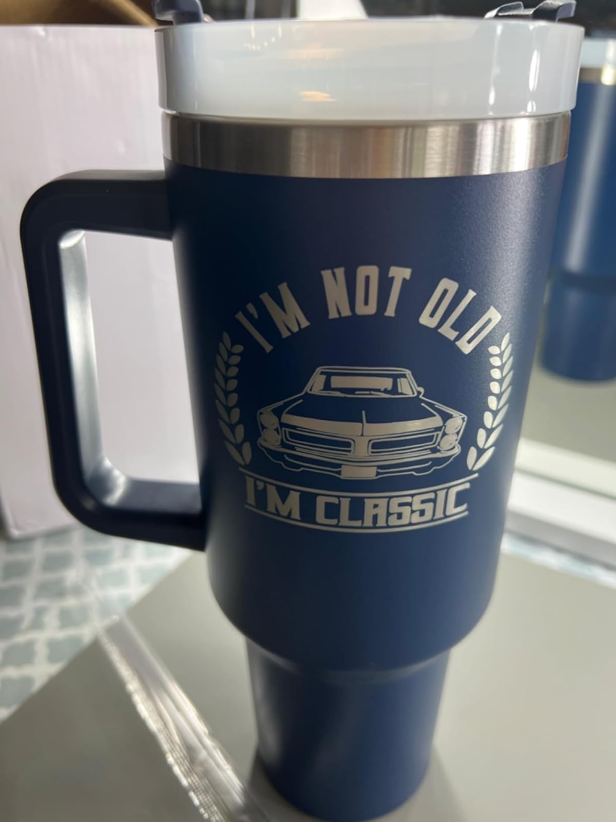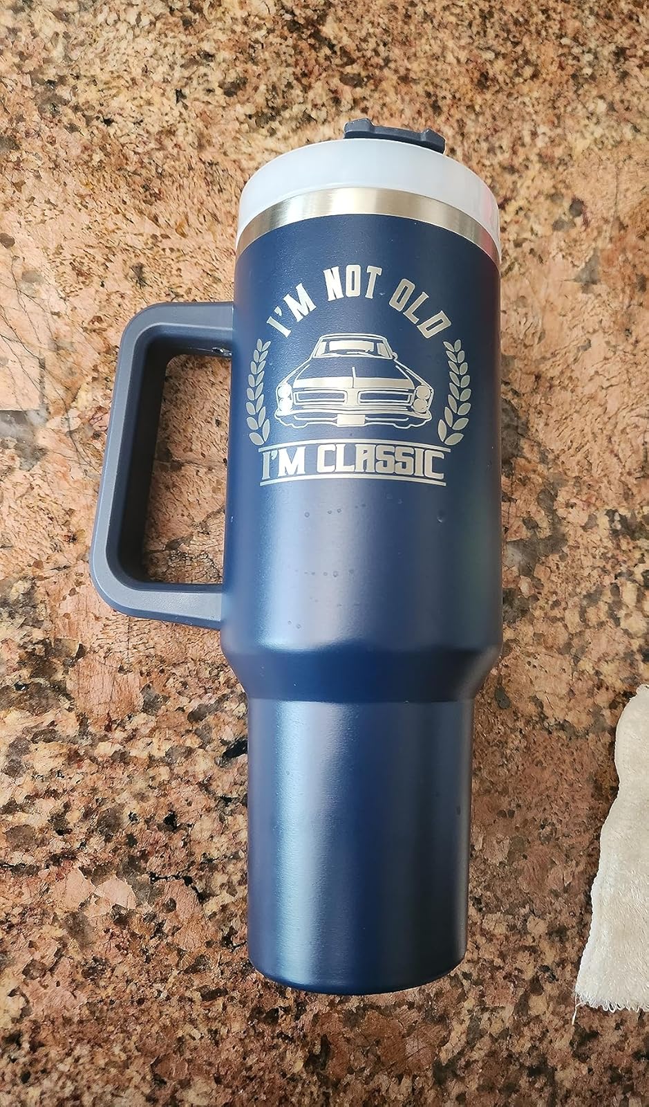 This is the perfect gift for grandpas. The humor in the design adds a personal touch that instantly brings a smile. The 40oz size is impressive and the handle is a thoughtful addition. The navy color is both stylish and timeless. This tumbler keeps drinks at the right temperature for hours.