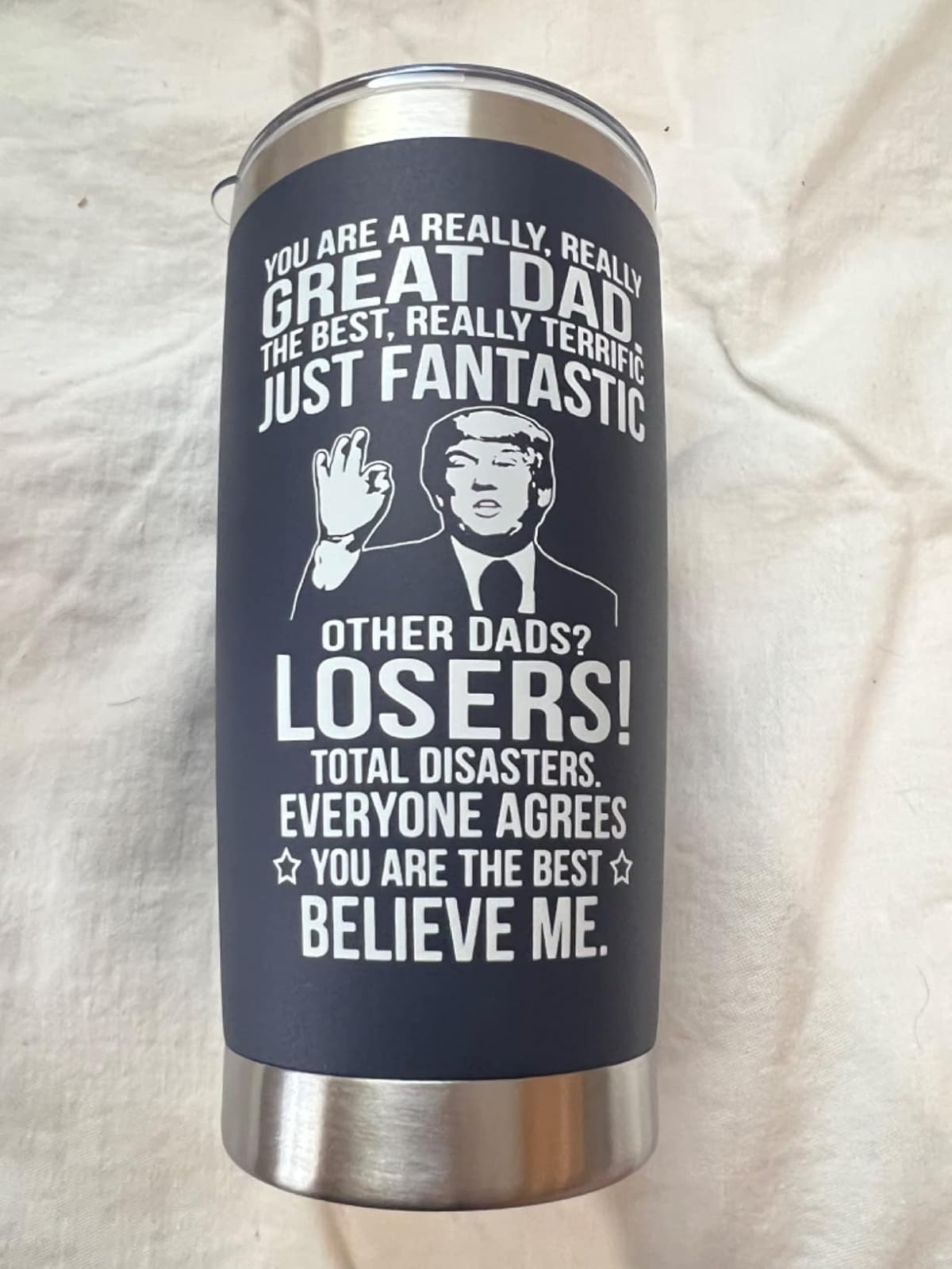 If you're looking for a funny gift for your dad that doesn’t just bring them a good laugh but is also a remarkably useful gift, you can't go wrong with this cup, 20oz tumbler.